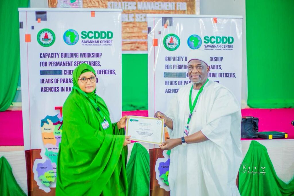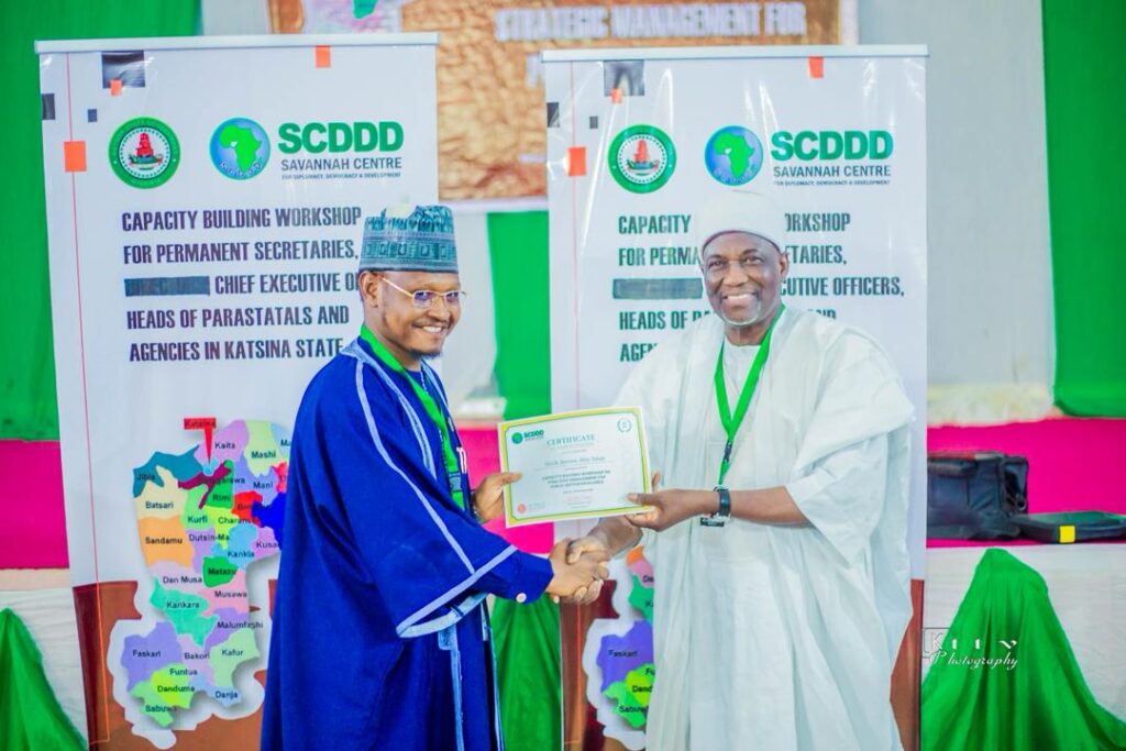 The two-day workshop, organized by the Savannah Centre for Diplomacy, Democracy and Development (SCDDD) in collaboration with the Katsina State Government, was held from 22nd –23rd December 2025 at the Bello Kofar Bai Hall, Katsina State Secretariat, with the theme, “Strategic Management for Public Sector Excellence